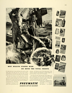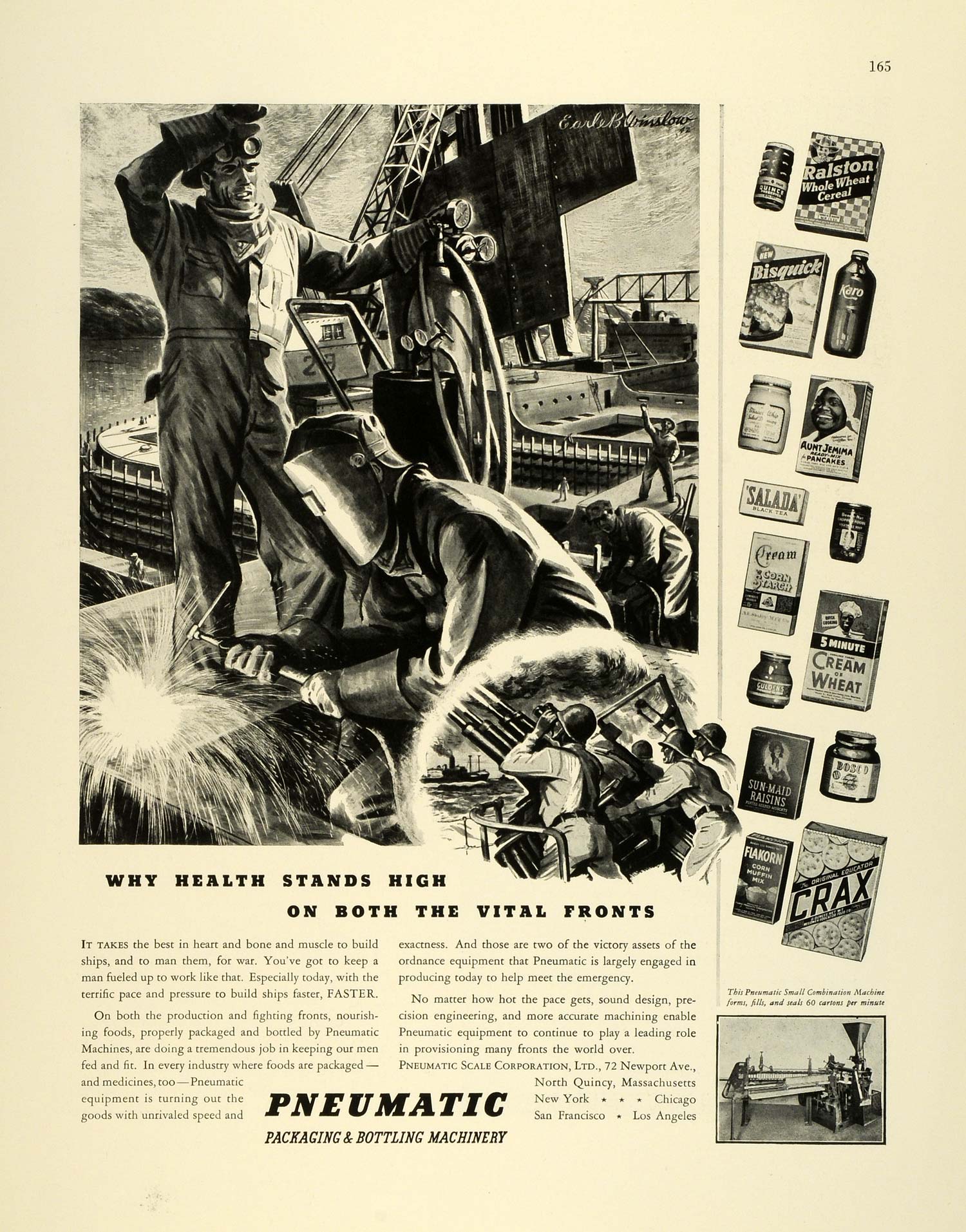 This is an original 1943 black and white print ad for the Pneumatic Packaging & Bottling Machinery from Pneutamic Scale Corporation, Ltd. located at 72 Newport Avenue, North Quincy, Massachusetts.