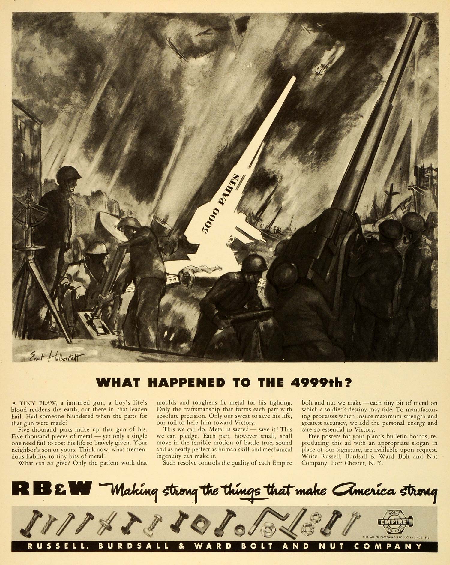 This is an original 1943 World War II black and white print ad for Russell, Burdsall and Ward Bolt and Nut Company (RB & W), who are doing their part to aid in the war production efforts by manufacturing a surplus of their products for use in war production plants, as well as by the U. S. military. This ad features artwork by Ernst Halberstadt.