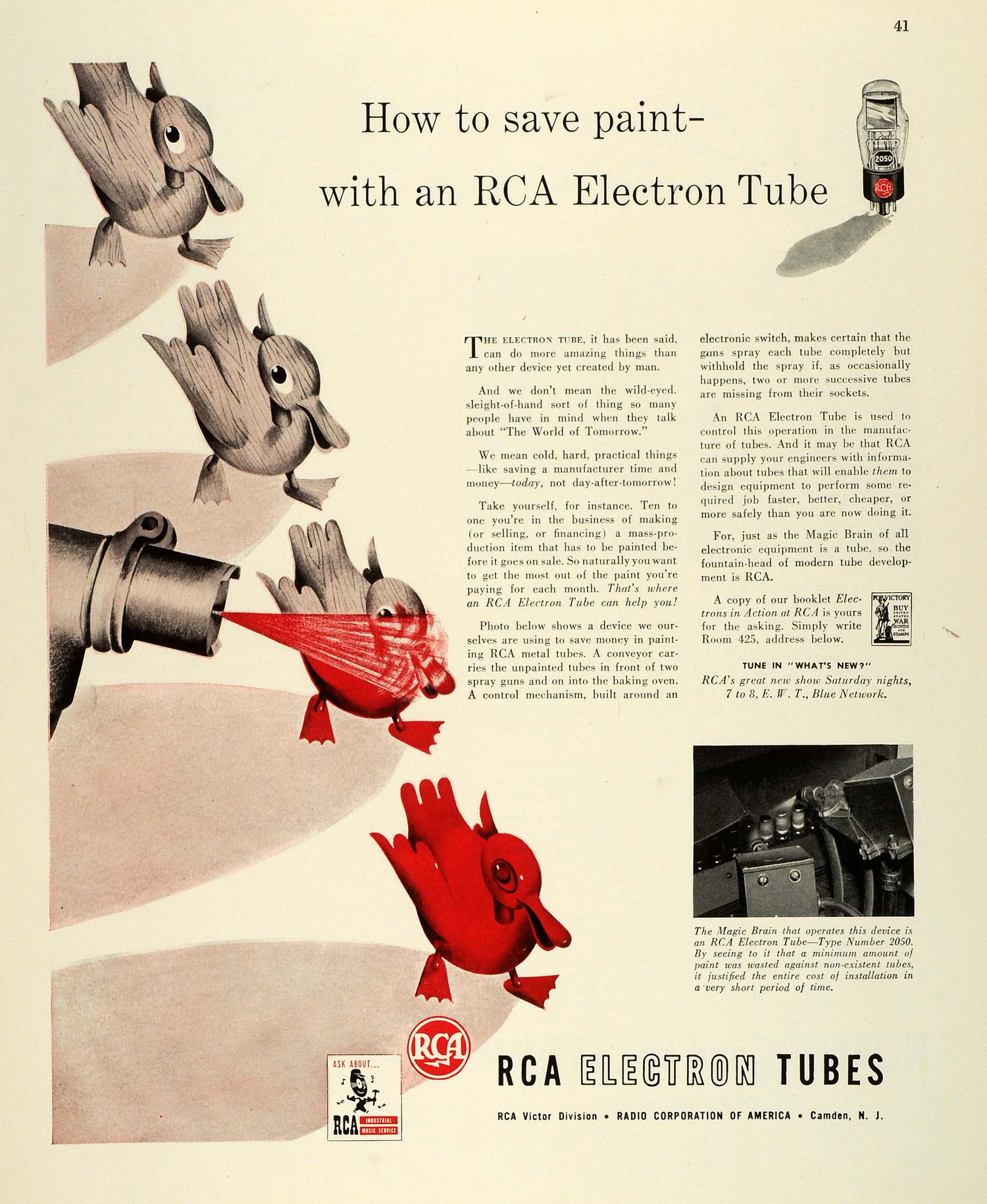 This is an original 1943 World War II two-color print ad for RCA Electron Tubes, now being used to conserve on paint in war production plants that require mass production painting.