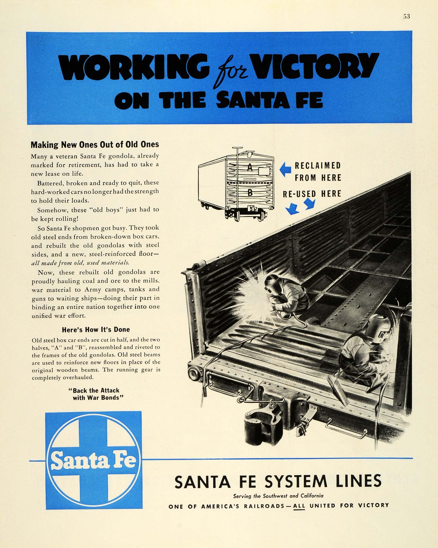 This is an original 1943 World War II two-color print ad for the Santa Fe System Lines, who are doing their part to aid in the war production and wartime shipping efforts by reconstructing old steel box cars into revamped gondolas for use in shipping wartime necessities to the U. S. military.