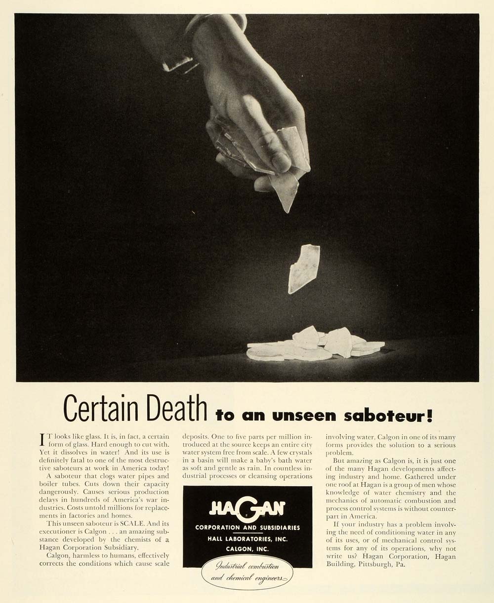 This is an original 1943 World War II black and white print ad for Calgon, a scale deposit remedy by the Hagan Corporation of Pittsburgh, Pennsylvania, who are doing their part to aid in the war production efforts by manufacturing Calgon to correct the hazardous and problematic chemical Scale, which often shows up in the pipes of war production plants.