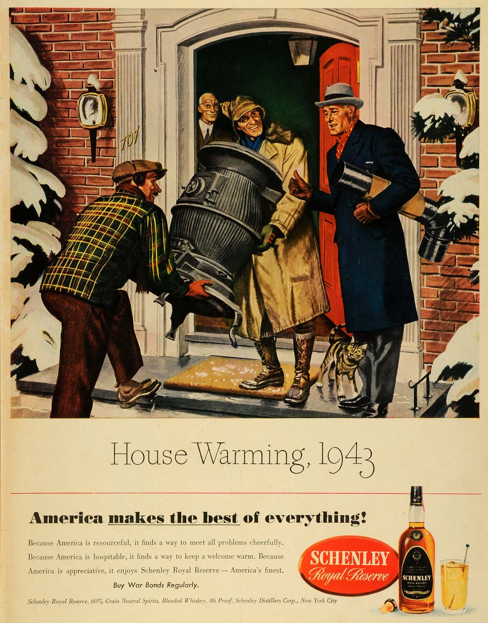This is an original 1943 World War II color print ad for Schenley Royal Reserve Whiskey.