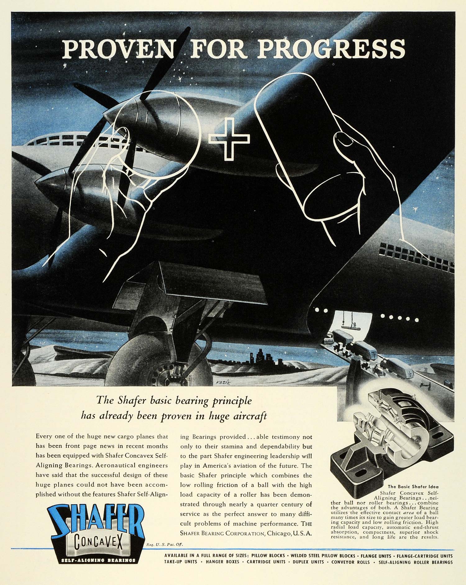 This is an original 1943 World War II two-color print ad for Shafer Concavex Self-Aligning Bearings, a product line by The Shafer Bearing Corporation of Chicago, who are doing their part to aid in the war production efforts by manufacturing a surplus of their products for use on military aircrafts. This ad features artwork by Kasik.