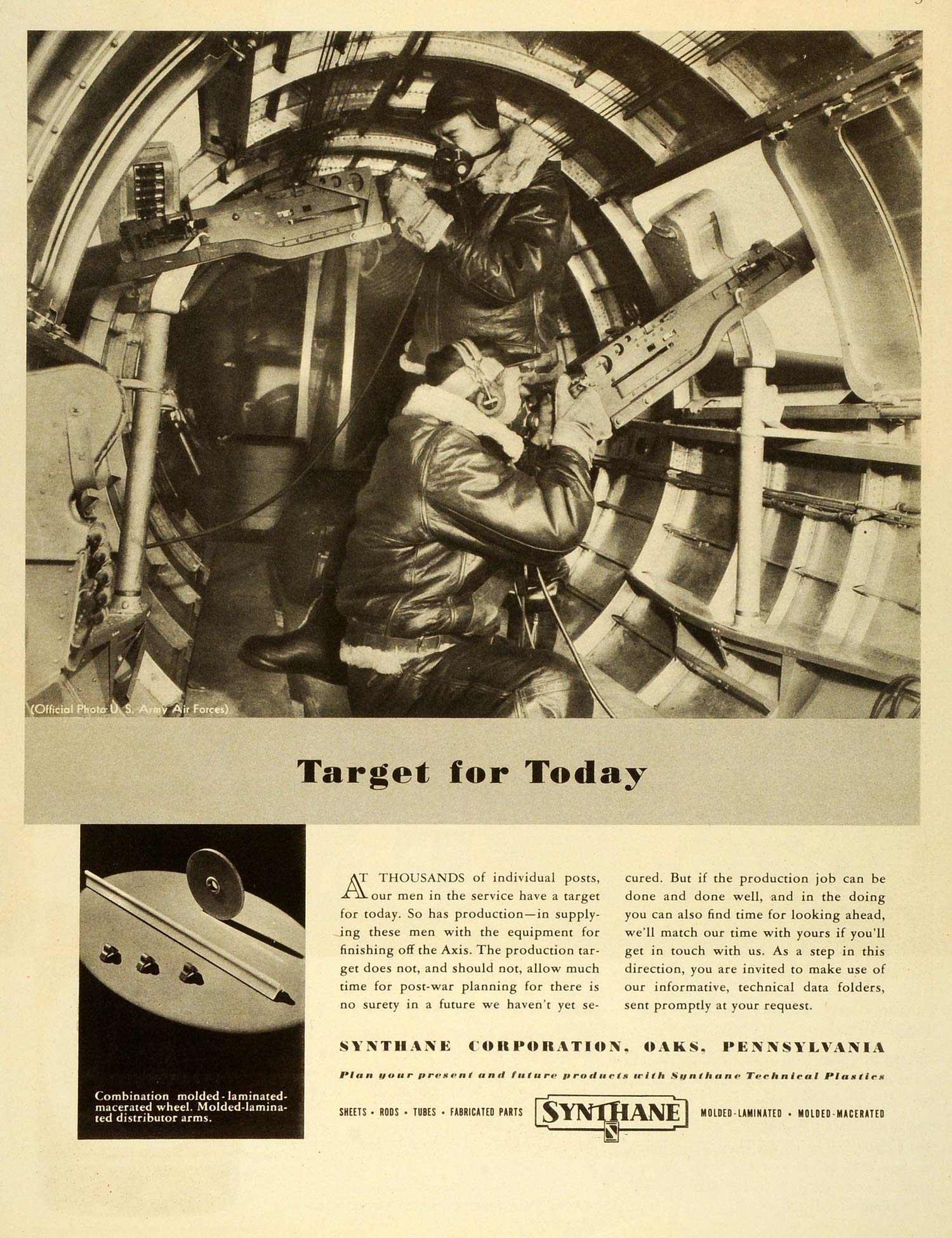 This is an original 1943 World War II black and white print ad for the Synthane Corporation of Oaks, Pennsylvania, who are doing their part to aid in the war production efforts.
