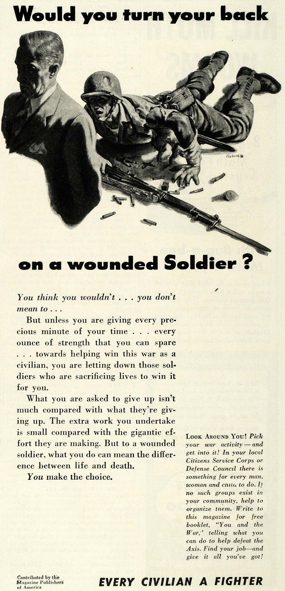 This is an original 1943 black and white print ad for Helping the Soldiers of the war from home.