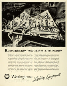 This is an original 1943 World War II black and white print ad for Westinghouse Lighting Equipment, a product line by the Westinghouse Electric Supply Company, who are doing their part to aid in the war production efforts by manufacturing a surplus of their illumination equipment for use in war production plants, as well as by the U. S. military.