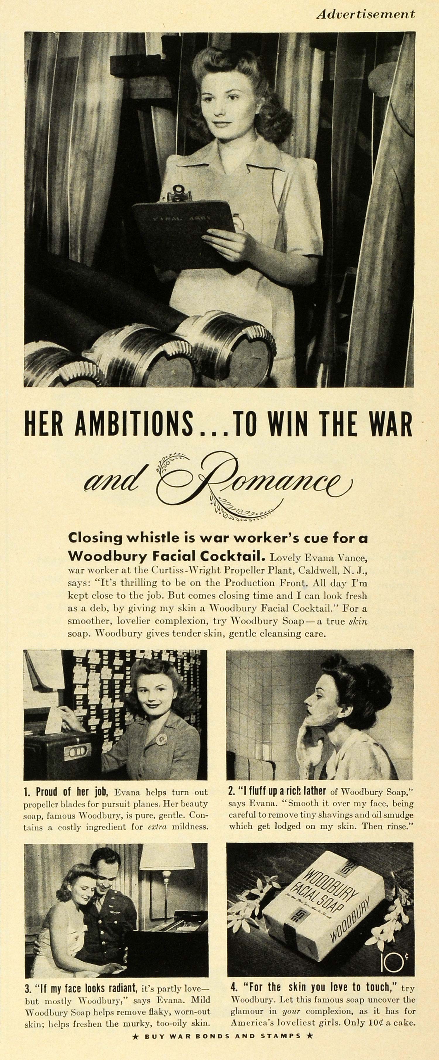 This is an original 1943 black and white print ad for Woodbury Facial Soap, feautirng Miss Evana Vance, a worker at the Curtiss-Wright Propeller Plant of Caldwell, New Jersey, during World War II.