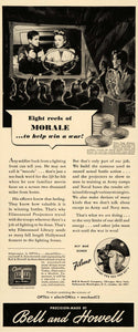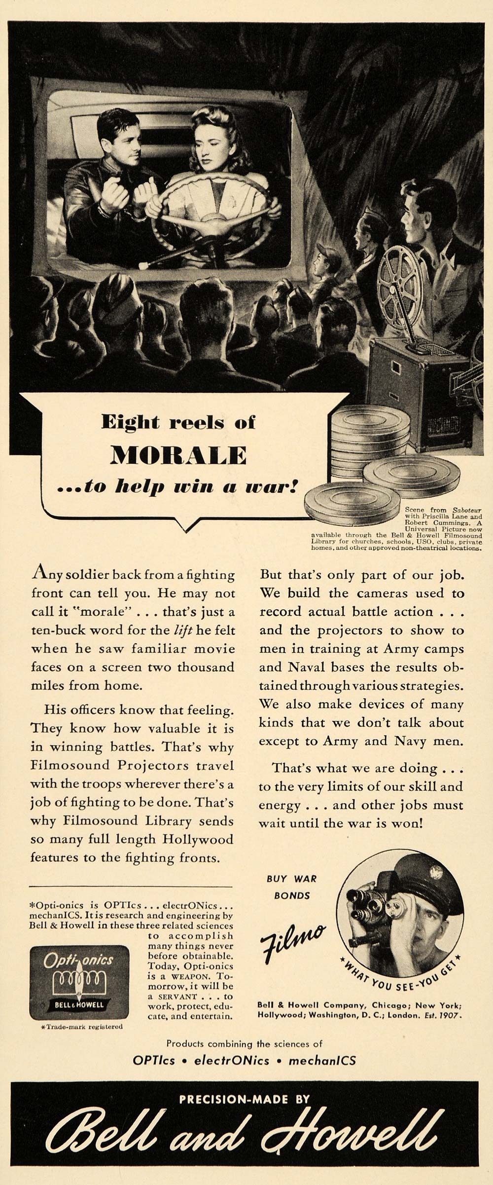 This is an original 1943 black and white print ad for the Filmosound Library and Projectors from Bell & Howell with a nice illustration of troops watching a scene from the 1942 Alfred Hitchcock movie "Saboteur" starring Pricilla Lane and Robert Cummings.