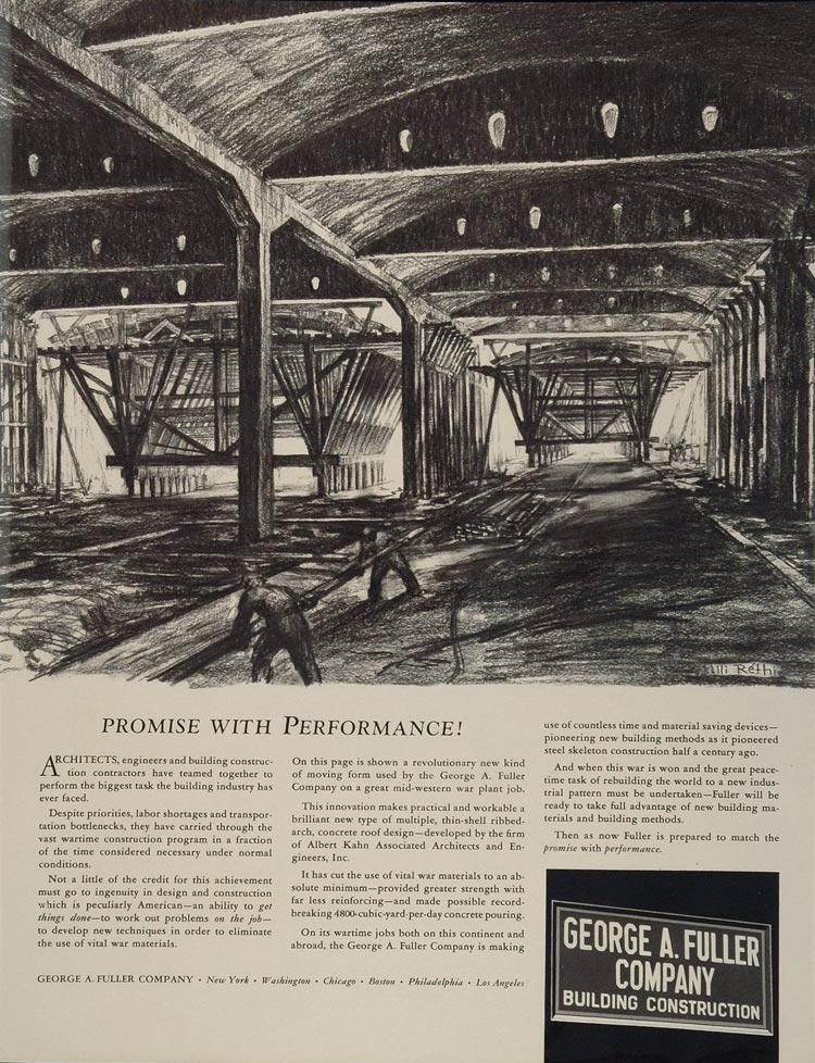 This is an original 1943 black and white print ad from the George A. Fuller Company, Building and Construction, with an illustration of a revolutionary new kind of moving form.