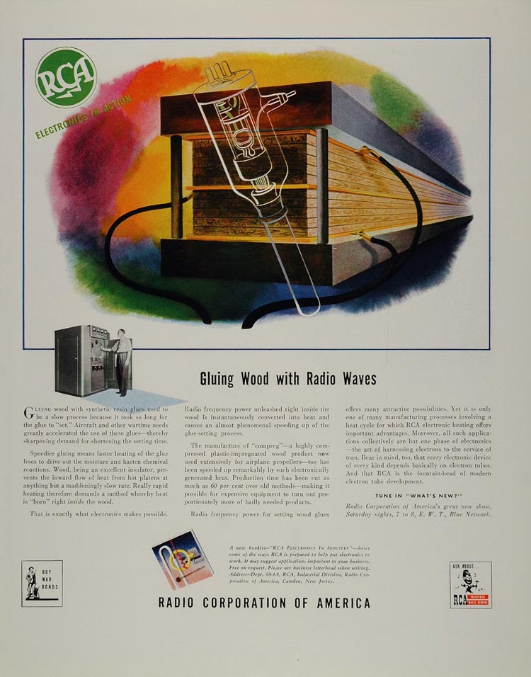 This is an original 1943 wartime color print ad from the Radio Corporation of America. Radio frequency power, converted into heat, helped to rapidly set the glue in the manufacture of compreg --a highly-compressed, plastic-impregnated wood product used in airplane propellers.