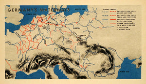 This is an original 1943 color print map titled, "Germany's Waterways." Shown in the map are rivers and canals with a capacity for ships under 600 tons, ships from 600-1200 tons, and ships over 1200 tons, as well as canals under construction and planned. Also shown are the locations of the Eder and Mohne Dams.