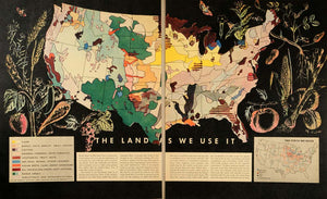 This is an original 1943 color print map titled, "The Land As We Use It," featuring an image of the United States color-coded by the types of agriculture grown in the area. Shown are areas of corn production; wheat, oats, barley and small grains; cotton; general farming (with tobacco); vegetables, fruit and nuts; dry peas, beans, and other legumes; sugar beets, cane, sweet sorghums; oil-producing crops (not cotton); range areas and subsistence and nonagricultural areas. An inset map in the bottom right hand corner shows the areas of dairy cow raising, beef cattle, hogs and sheep. Please note that this image was printed on two separate pages, but could easily be framed together.