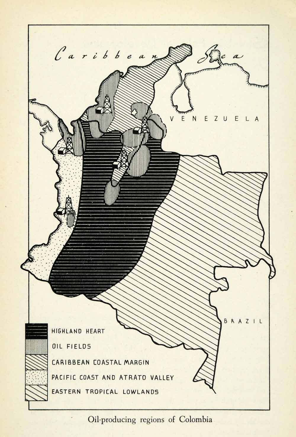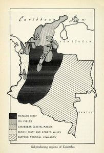 This is an original 1943 halftone print map of the oil-producing regions in the country of Colombia in South America.