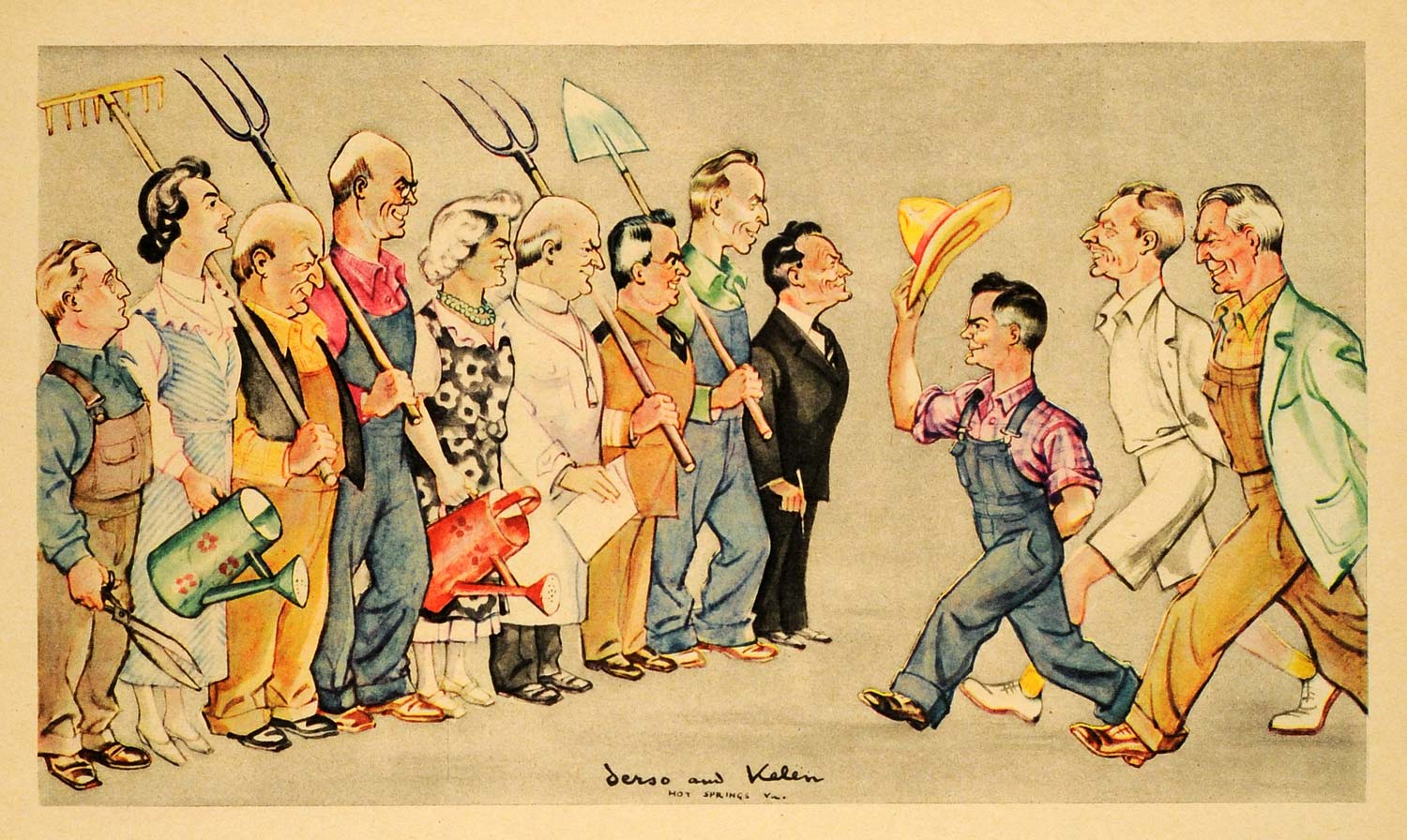 This is an original 1943 color print cartoon featuring United States delegates and advisors holding farming tools to Appleby, Acheson and Clayton. Shown from left to right on the agricultural side is Benjamin Gerig of the State Department, Hazel K. Stiebeling, H. R. Tolley, Murray D. Lincoln of the Ohio Farm Bureau Federation, Miss Josephine Schaine-- former director of the Girl Scouts of America, Dr. Frank G. Boudreau of the U. S. Public Health Service, Dr. Thomas Parran, Ralph H. Allee, and Warren Kelchner of the State Department.