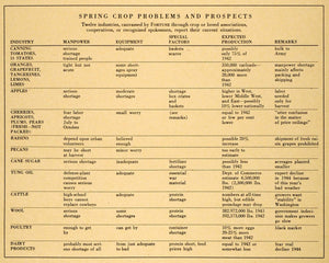 This is an original 1943 halftone print titled, "Spring Crop Problems and Prospects." The chart gives information on the industry, manpower, equipment, special factors, expected production and remarks to the industries of canning tomatoes; citrus fruits; apples; cherries, apricots, plums and pears; raisins; pecans; cane sugar; tung oil; cattle; wool; poultry; and dairy products.