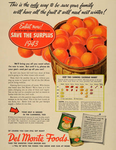 This is an original 1943 color print ad from Del Monte Foods encouraging women to join the Del Monte Cooperative Conservation Program "Save the Surplus in 1943" as part of the wartime home front effort.