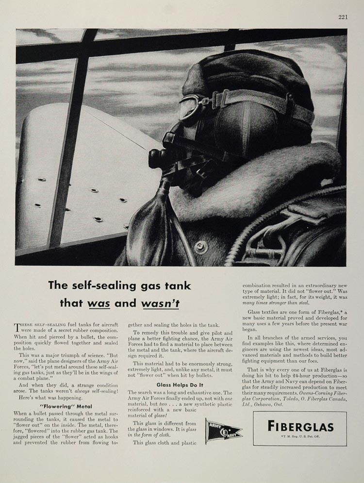 This is an original World War II era ad from the Owen-Corning Fiberglas Corporation of Toledo, Ohio., manufacturers of FiberglasÐÐthe glass textile used in self-sealing fuel tanks for miltary aircraft.