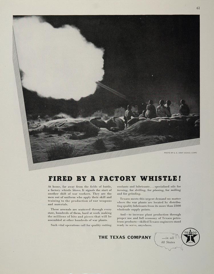 This is an original World War II era ad from TexacoÐÐThe Texas Company. The ad has a dramatic image of a nighttime scene on the battlefront.