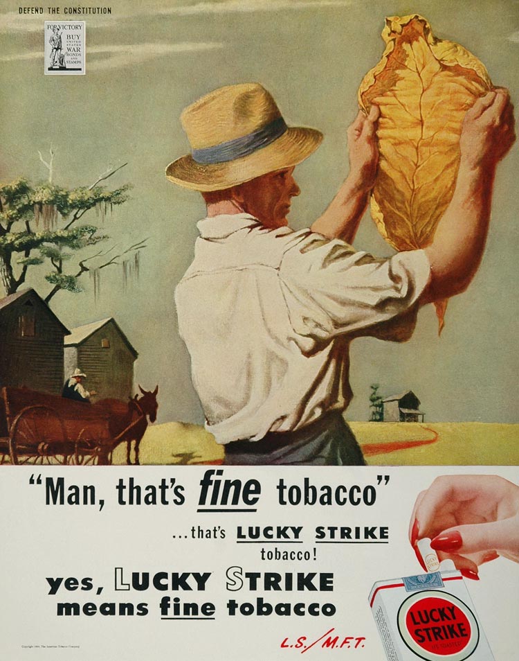 This is an original World War II era ad for Lucky Strike cigarettes. The ad has a great illustration of a tobacco farmer examining a tobacco leaf.