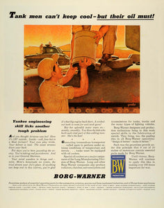 This is an original 1944 color print ad for the Borg-Warner Company, makers of essential operating parts for the automotive, aviation, marine and farm implement industries.
