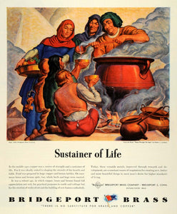 This is an original 1944 color print ad for the Bridgeport Brass Company located in Bridgeport, Connecticut. This ad features a painting from the mural "Brass Through The Ages", by Robert L. Lambdin.