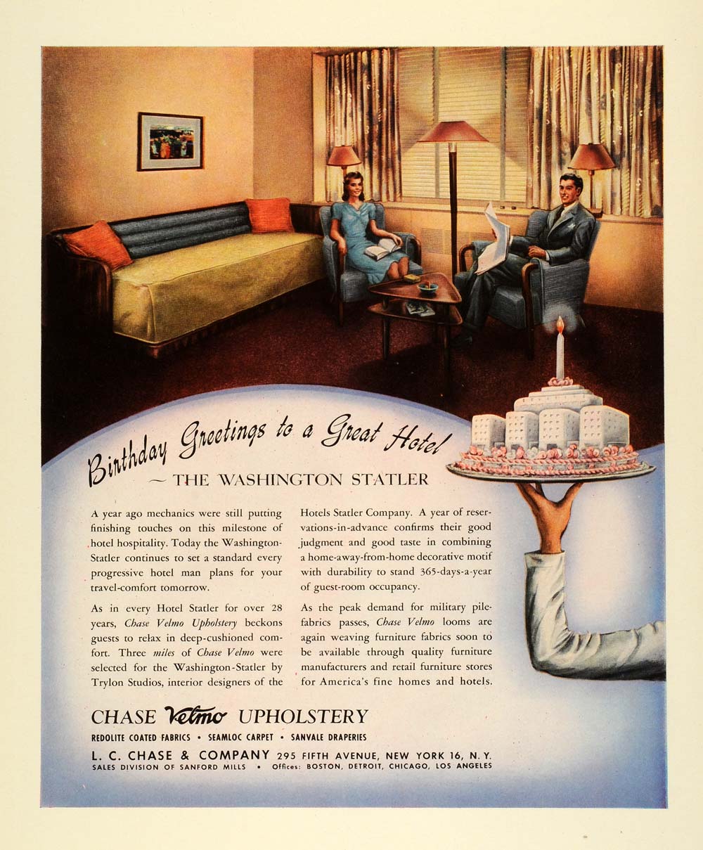 This is an original 1944 color print ad for the Chase Velmo Upholstery including the Redolite Coated Fabrics, Seamloc Carpet and Sanvale Draperies from L. C. Chase and Company located at 295 Fifth Avenue, New York City.