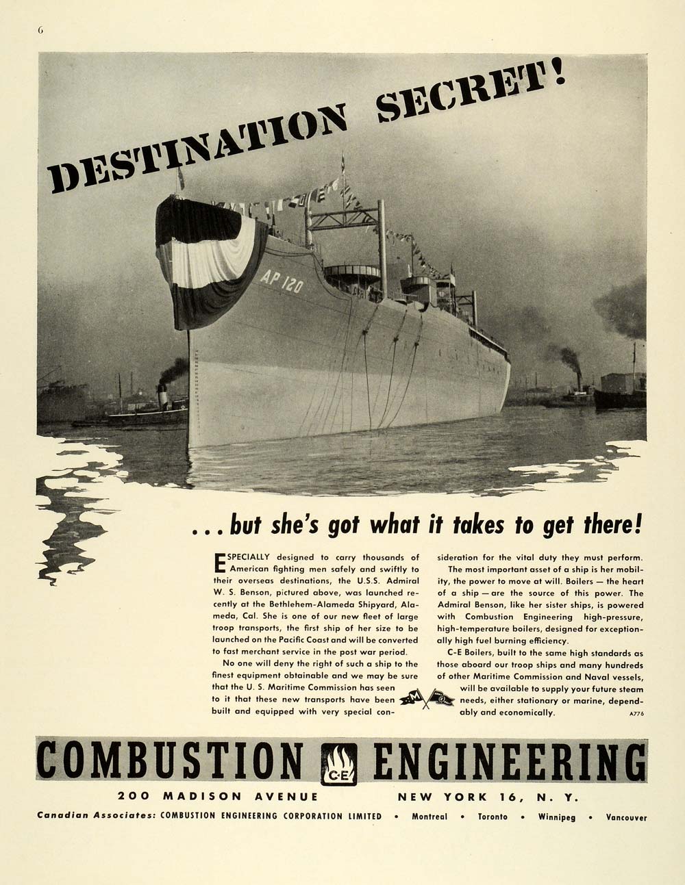 This is an original 1944 black and white print ad for the Combustion Engineering Corporation Limited located at 200 Madison Avenue, New York City. This ad features an image of the USS Admiral W. S. Benson that was launched at the Bethleman-Alameda Shipyard, Alameda, California.
