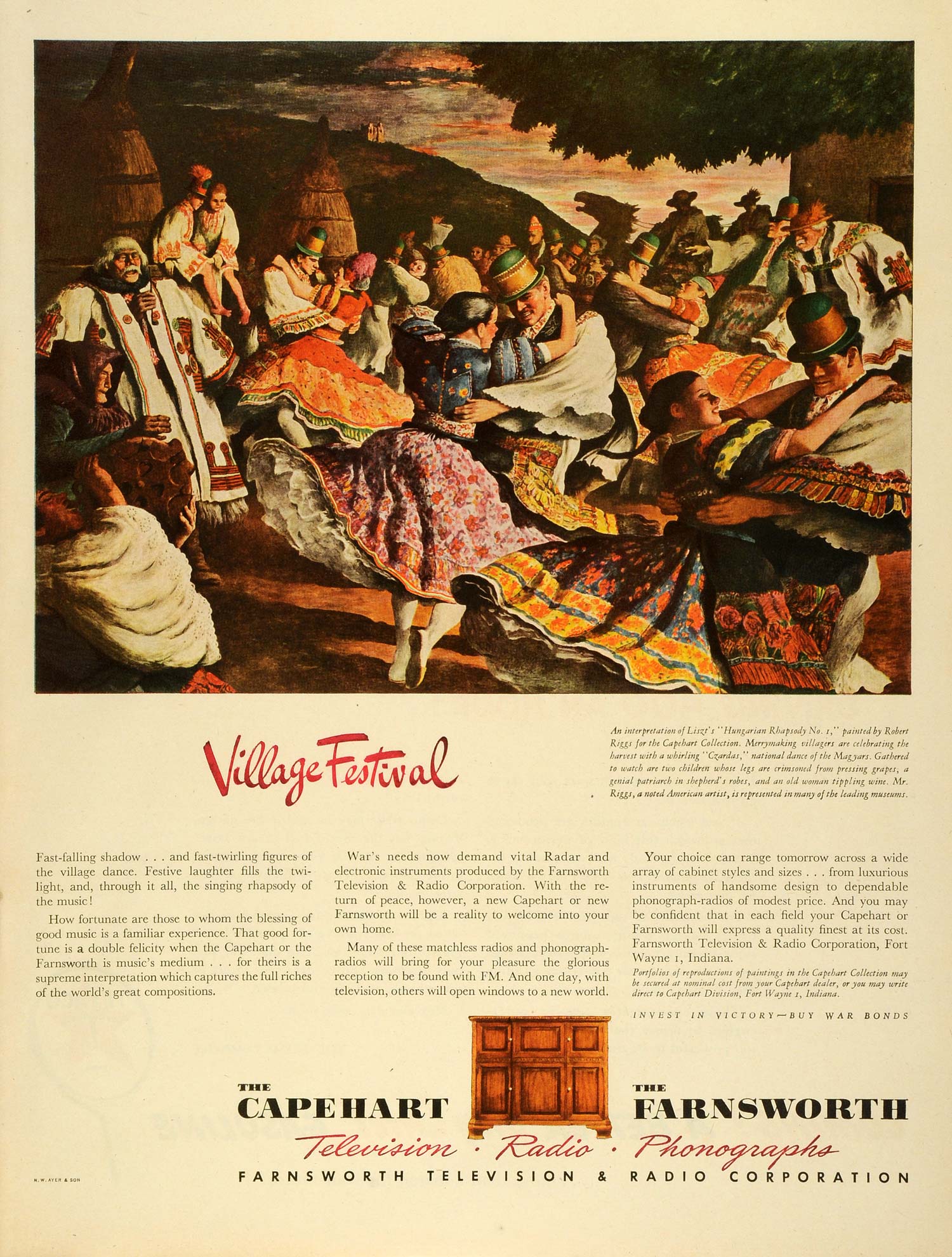 This is an original 1944 color print ad for the Capehart and Farnsworth Radio from Farnsworth Television & Radio Corporation located in Fort Wayne, Indiana. This ad features an interpretation of Liszt's "Hungarian Rhapsody No. I", painted by Robert Riggs for the Capehart Collection.