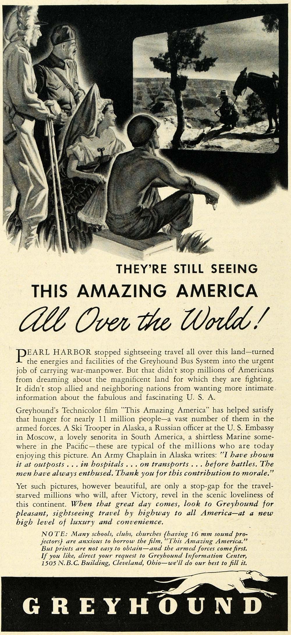This is an original 1944 black and white print ad for the Greyhound Bus System located in Cleveland, Ohio.