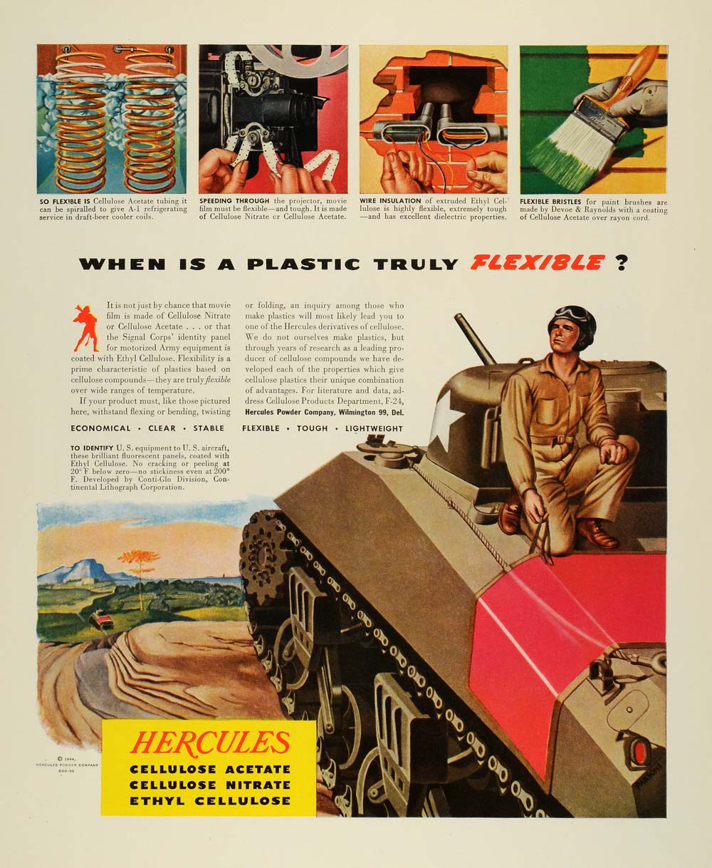 Keywords specific to this image: Vintage Advertising, military, soldiers, G. I., military vehicle, war production, Cellulose Acetate spiral tubing, projector, wire insulation, bristles, paint brush