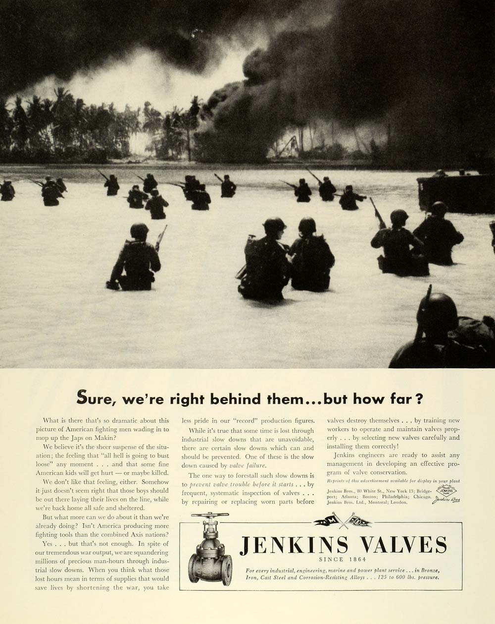 This is an original 1944 black and white print ad for the Jenkins Valves from Jenkins Company located at 80 White Street, New York City.