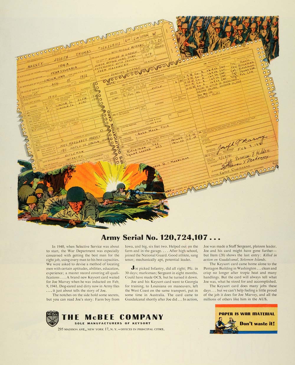 This is an original 1944 color print ad for the McBee Company, sole manufacturers of Keysort located at 295 Madison Avenue, New York City.