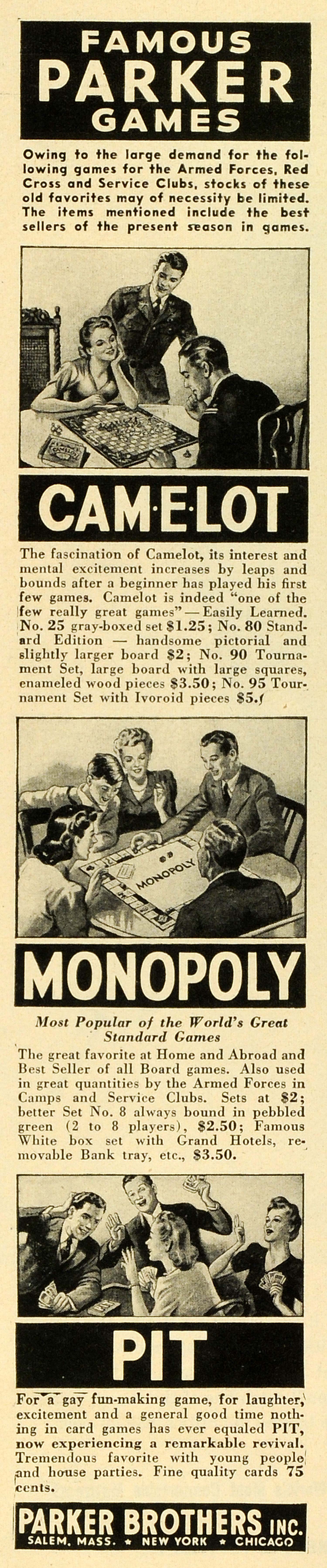 This is a small original 1944 black and white print ad for Parker Brothers, Incorporated, of Salem, Massachusetts, as well as New York and Chicago; this ad features their famous Parker Games, such as Camelot, Monopoly, and Pit.