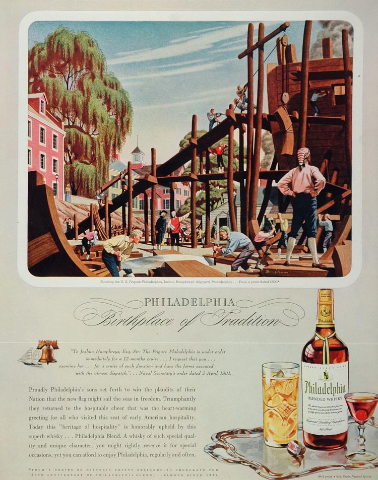 This is an original World War II era ad for Philadelphia Blended Whisky. The illustration of the building of the U.S. Frigate Philadelphia in Joshua Humphrey's shipyard is from a print dated 1800.