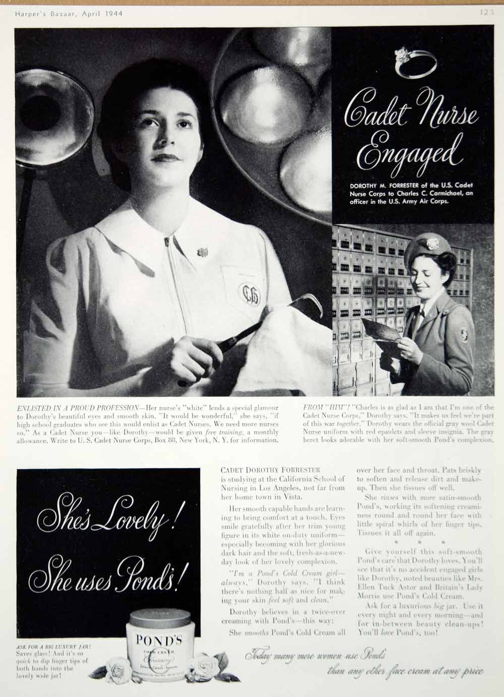 This is an original 1944 black and white print ad for Ponds Cold Cream featuring Cadet Nurse Dorothy Forrester who is engaged to Charles C. Carmichael, an officer in the U.S. Army Air Corps.