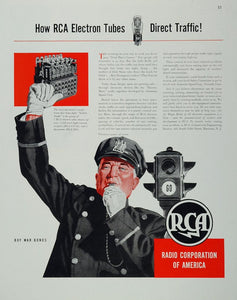 This is an original World War II era ad from RCA Ð Radio Corporation of America, manufacturer of RCA electron tubes which help direct traffic. The ad has a nice illustration of a traffic cop blowing his whistle.