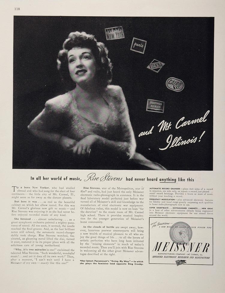 This is an original World War II era ad from the Meissner Manufacturing Company of Mt. Carmel, Illinois, manufacturer of the Meissner electronic radio-phonograph. The ad has a nice photo of the beautiful singer Rise Stevens.