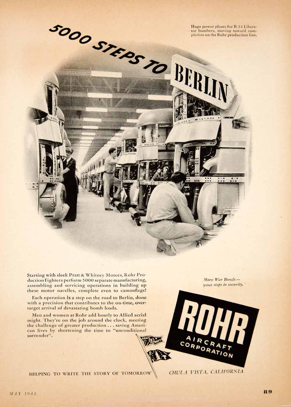 This is an original 1944 black and white print ad for Pratt & Whitney airplane motors that were assembled and serviced by Rohr Aircraft Corporation of Chula Vista, California (CA) for use in B-24 Liberator bombers during World War II.