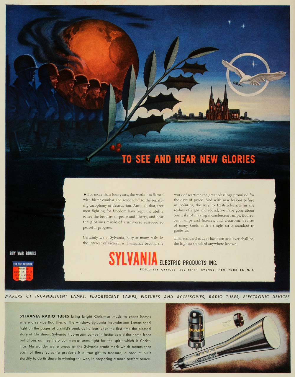 This is an original 1944 color print ad for the Sylvania Electronic Products Incorporation, makers of incandescent lamps, fluorescent lamps, fixtures, accessories, radio tubes, and electronic devices, located at 500 Fifth Avenue, New York City.