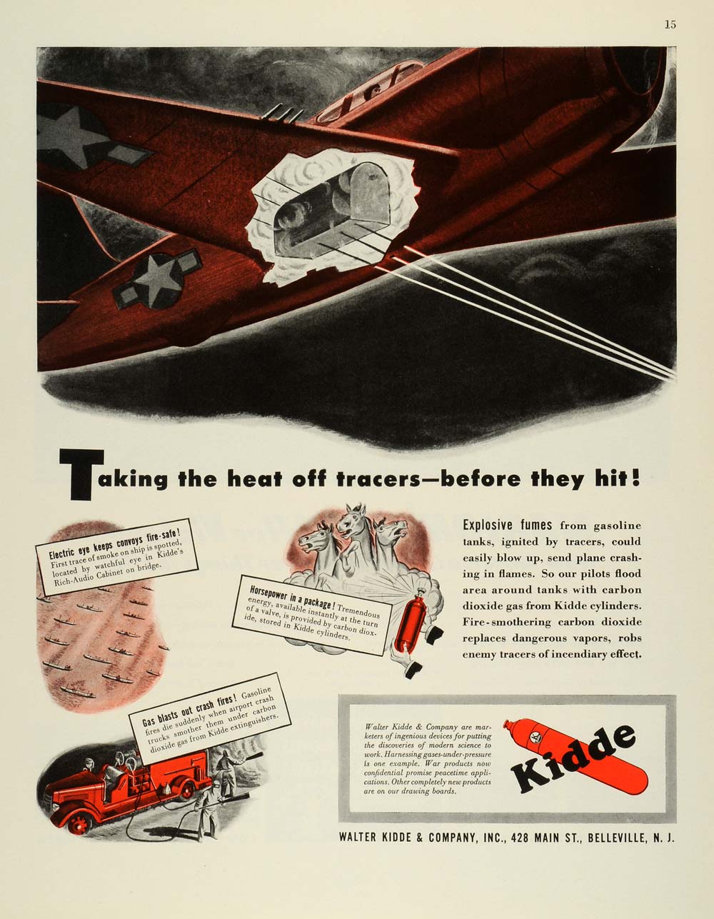 This is an original 1944 two-color print ad for the Kidde Cylinders from Walter Kidde & Company, Incorporation located at 428 Main Street, Belleville, New Jersey.