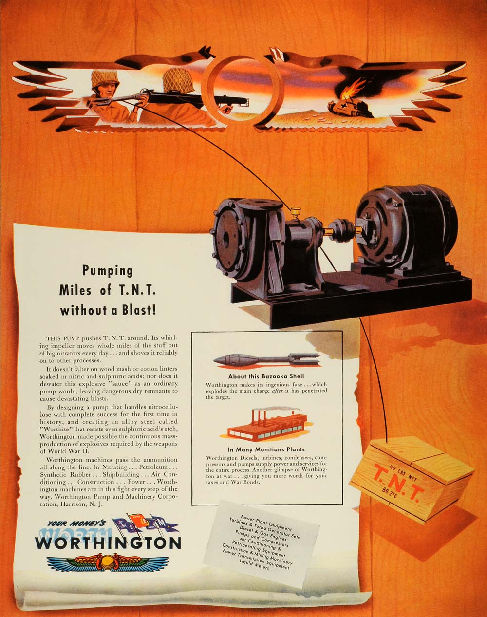 This is an original 1944 color print ad for the Worthington power plant equipment, turbines, turbo generator sets, diesel & gas engines, pumps & compressors, air conditioning & mining machinery, power transmission equipment and liquid meters from Worthington Pump and Machinery Corporation located in Harrison, New Jersey.
