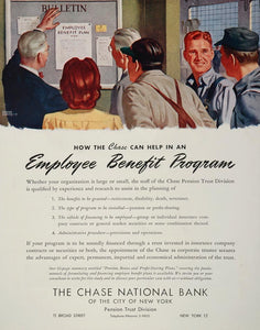 This is an original World War II era ad from the Pension Trust Division of The Chase National Bank of the City of New York about how the Chase can help in an emplyee Benefit Program. It was illustrated by Lyman Anderson.