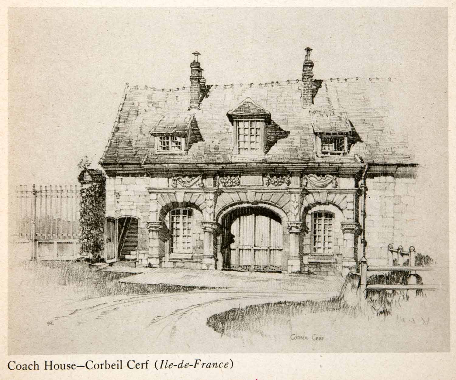 This is an original 1944 black and white photogravure of a coach house in the small village of Corbeil-Cerf which is located in northern France. This village is a commune in the Oise department. A coach house or carriage house was an outbuilding used to store horse-drawn carriages in the past.