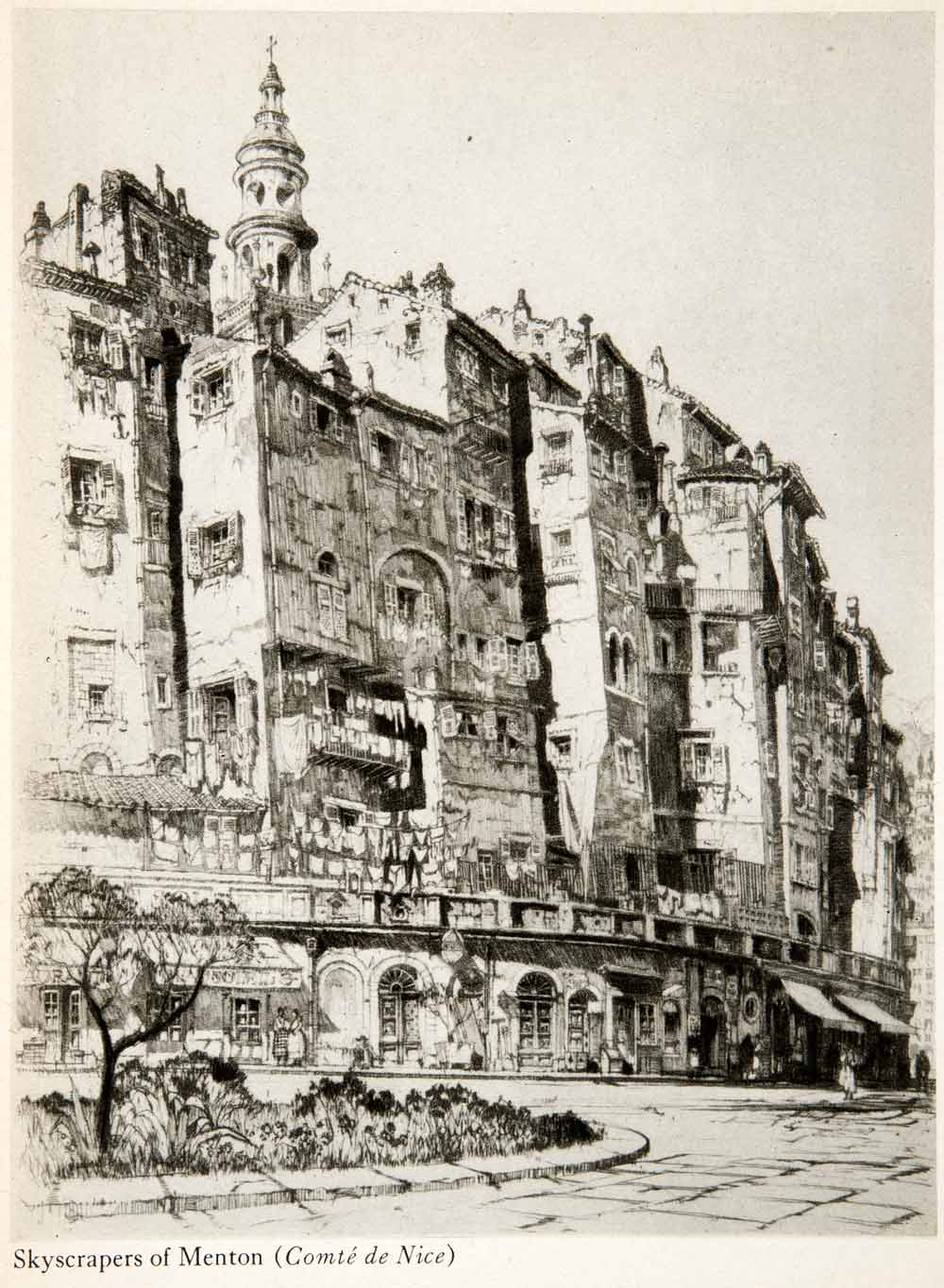 This is an original 1944 black and white photogravure of apartment buildings and shops in the city of Menton, France. This commune is located in the Provence-Alpes-Côte d'Azur region of southeastern France. It is near to the Italian border along the French Riviera.