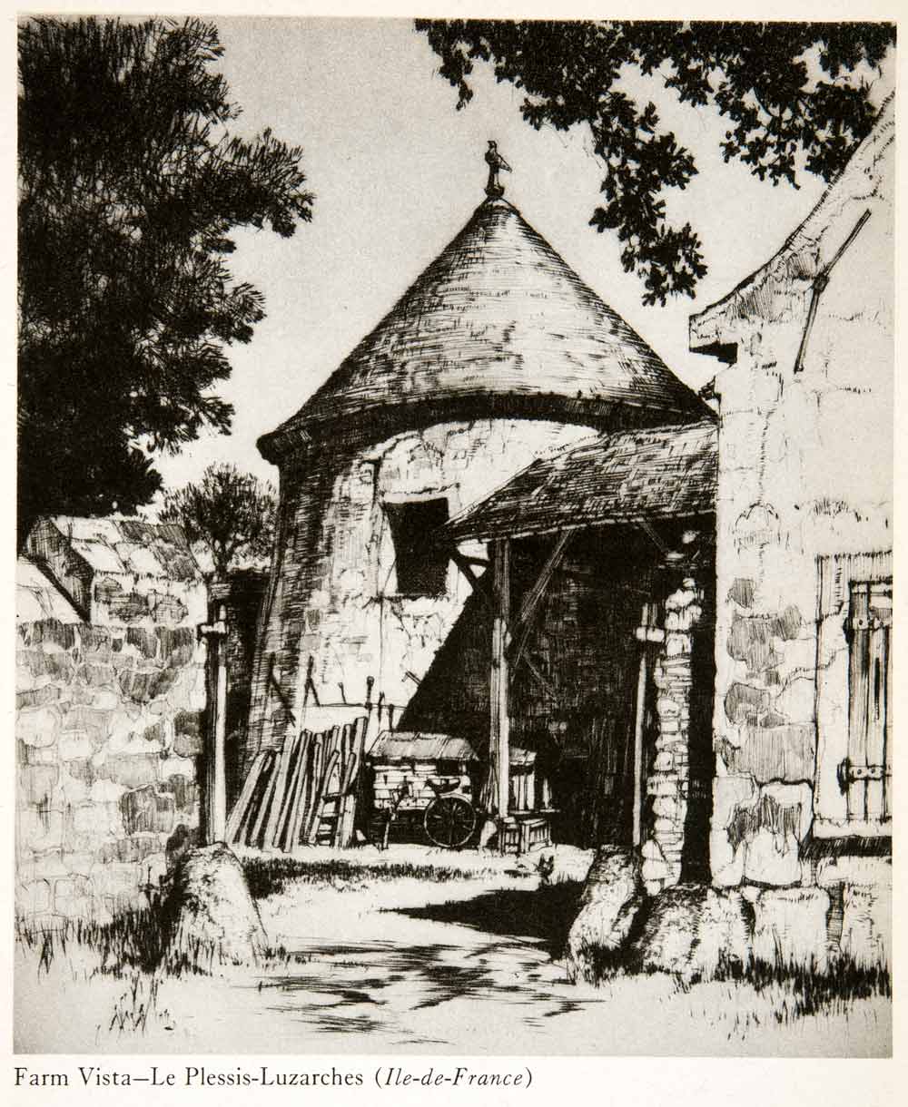 This is an original 1944 black and white photogravure of a "pigeonnier" (pigeon loft) on a farm in Le Plessis-Luzarches which is a commune in northern France. It is located in the Val-d'Oise department in the Ile-de-France region.