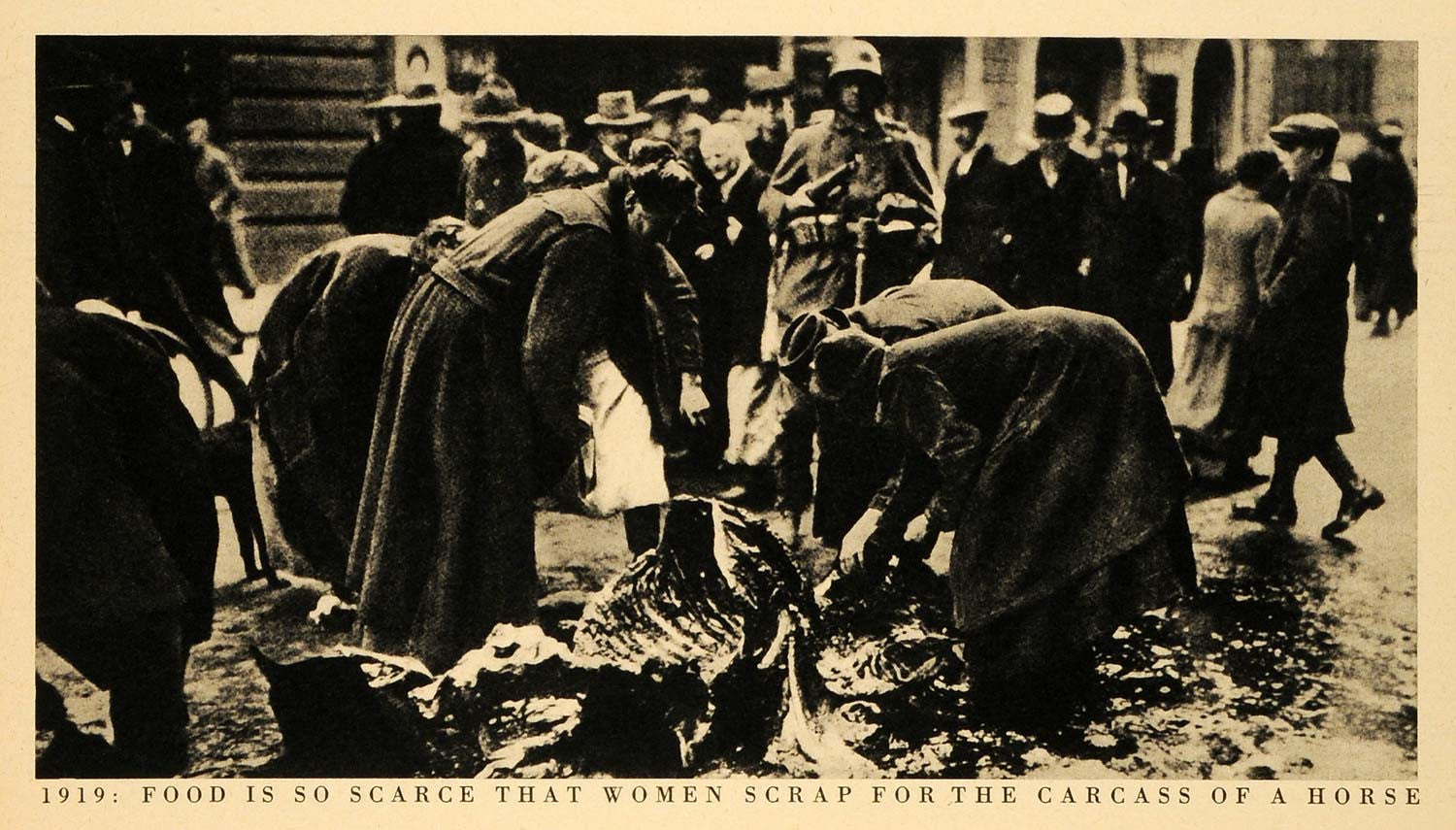 This is an original 1944 halftone print of Germans pulling the meat off a horse carcass in 1919 due to the scarcity of food at the time. The value of the German mark declined at a fierce rate beginning in 1919, due to war reparations, the loss of land and colonies, the French occupation of the industrial Ruhr valley, and the printing of more money instead of less. In January of 1919, the United States dollar was worth 8.9 marks, and by 1922, it was worth 192 marks.