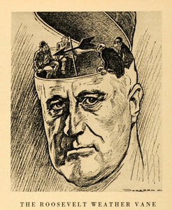This is an original 1944 halftone print of a cartoon of Franklin Delano Roosevelt. The president's skull is cut open to reveal a weather vane, and four men blowing on it. The cartoon highlighted the president's economic indecisiveness.
