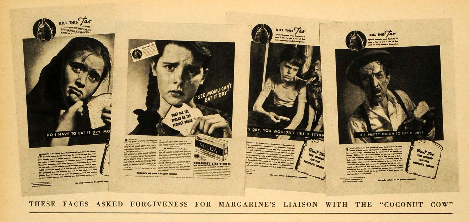 This is an original 1944 halftone print of various advertisements for margarine. The caption writes, "These faces asked forgiveness for margarine's liaison with the 'coconut cow.'" Before World War I, margarine was mostly comprised of animal fats-- oleo and lard. During World War I, the scarcity of ingredients lead researchers to find a different recipe; coconut oil was imported and introduced into the spread, and was politically hazardous for the industry. After 1932, margarine makers began to incorporate domestic oils into their spreads, including cottonseed and later soybean.