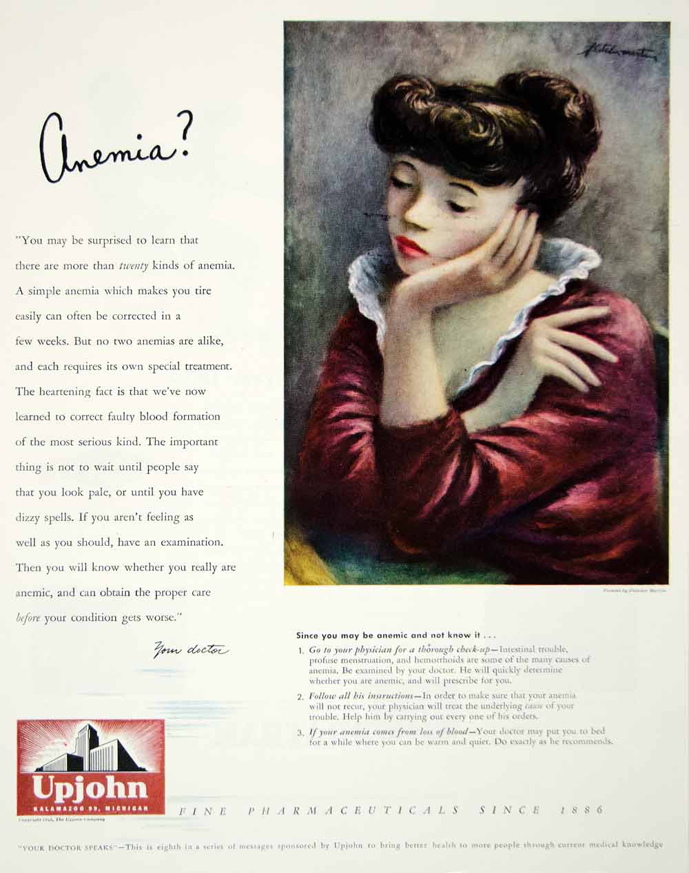 This is an original 1945 color print ad for Upjohn pharmaceuticals, who were developing ways to deal with anemia.