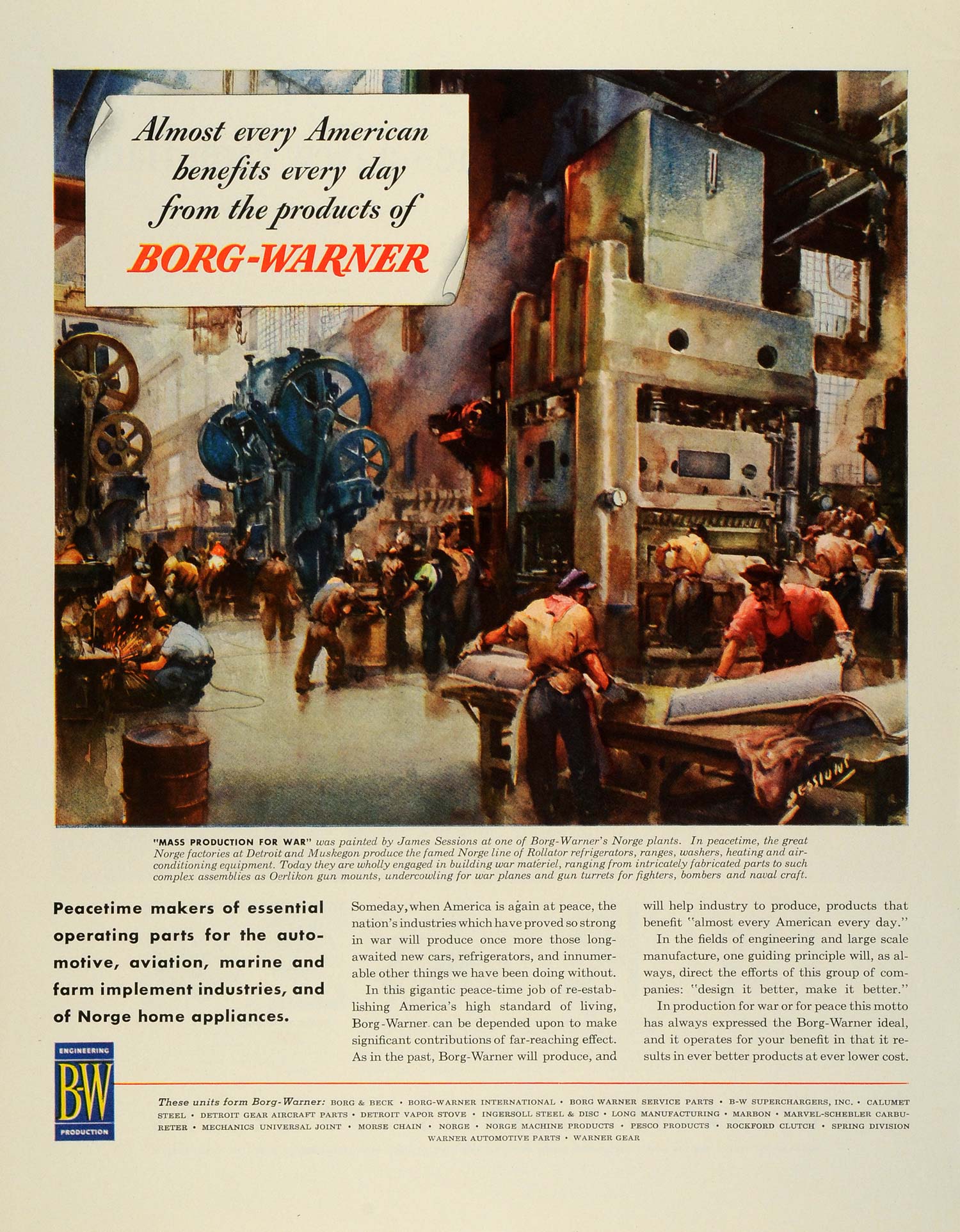 This is an original 1945 color print ad for the Borg-Warner Company, makers of essential operating parts for the automotive, aviation, marine, and farm implement industries, and of Norge home appliances. This ad features an illustration of the mass production for war at one of Borg-Warner Norge plants located in Detroit and Muskegon, producers of Rollator refrigerators, ranges, washers, heating, air conditioning equipment; and Oerlikon gun mounts, undercowling for war planes and gun turrets for fighters, bombers, and naval craft.